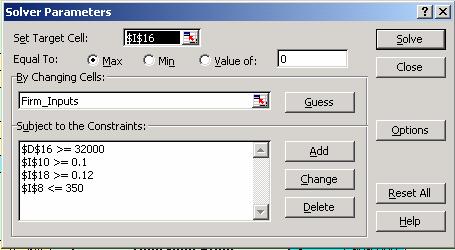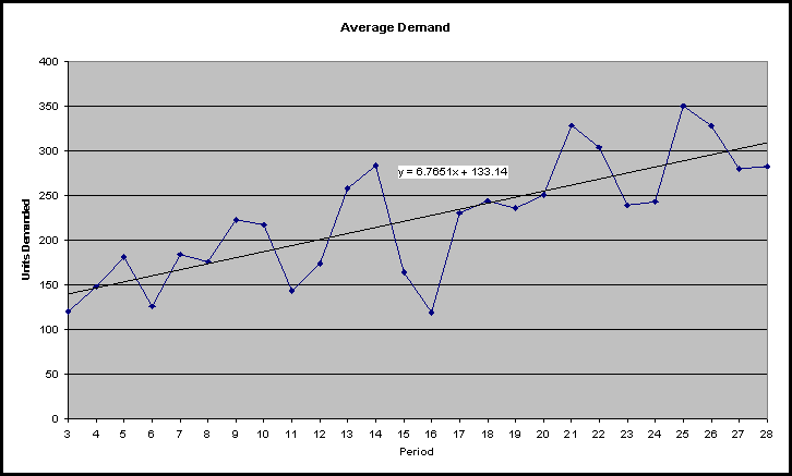 Average Firm demand is calculated using time forecasting and regression calculations. The user can change the current input variables to see the possible impact. Solver will take the inputs from these calculations in determining firm demand. Firm demand is constrained at 350 units. The firm can only produce a maximum of 350 units, therefore any units demanded above 350 could not be produced.