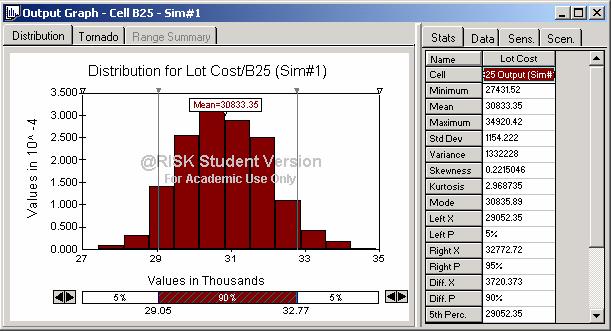 The above screen shot is one simulation, is the histogram created using @risk. The above chart shows that the cost of each lot will cost between $28,980 and 32,840 with a 90% confidence level. This means that 90% of the time the lot cost will fall within this range. The mean cost per lot is $30,833. this is the lot cost that is used to calculate the profit for the firm.