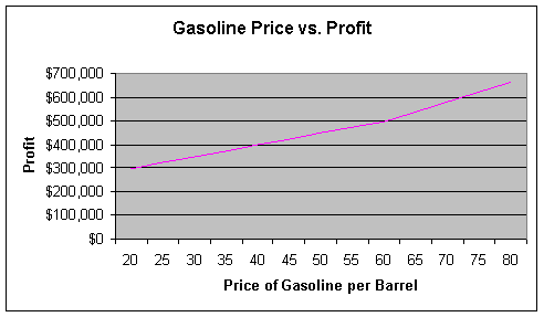 The first example shows how a change in price will affect the change in profit. Looking at the example, with price starting at $20 and increasing at $5 increments, one can see the additional profit earned by the price change. As the price of gasoline increases, the production level of gasoline will increase and the production of heating oil will be reduced to find the optimal profit level at given price levels.