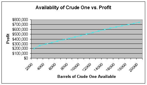 The following chart represents the change in profit based on the availability of crude oil one. Since crude oil one has higher quality content, as the quantity available increases, more gasoline will be produced maximizing profits. An important issue to remember in this model is that cost of the raw materials and the cost to produce the product is not considered. This is mostly a revenue model.