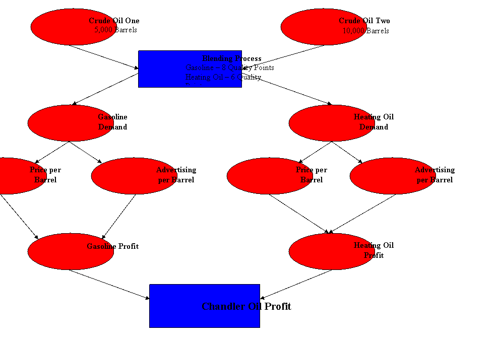 For this example, the company, Chandler Oil, produces only two types of products. The two products produced, gasoline and heating oil, require the same type of raw material to produce the end product. The only difference for the two products is the mix required to produce the end product. To produce the gasoline and heating oil, two types of crude oil are required, crude oil 1 and crude oil 2. Crude oil one is of higher quality and cost more than crude oil two. Gasoline requires a higher quality than does heating oil leading to a higher average cost per barrel of gasoline . Since gasoline requires a higher quality standard than heating oil, the company can produce less gasoline than heating oil with the raw materials available. The model will take into account all of the different factors list above, using solver within excel, to determine the optimal level of production to maximize company profit.